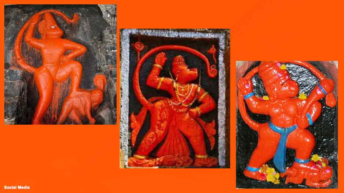 या मूर्तीत मारुतीचा उजवा हात कानशिलाजवळ चापट मारण्याच्या स्थितीत उगारलेला असतो.