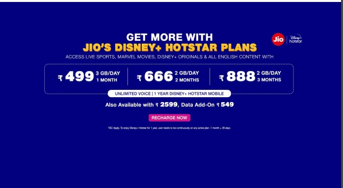 सणासुदीच्या सुरुवातीला रिलायन्स जिओने आपल्या वापरकर्त्यांसाठी आनंदाची बातमी आणली आहे. रिलायन्स जिओने 1 सप्टेंबरपासून नवीन प्रीपेड प्लॅन सुरू करण्याची घोषणा केली आहे. दर महिन्याला 499 रुपयांपासून सुरू होणाऱ्या या प्रीपेड प्लॅनचे वैशिष्ट्य म्हणजे यात कोणत्याही अडथळ्याशिवाय डिज्नी हॉटस्टारचं फुल कंटेंट मिळेल.