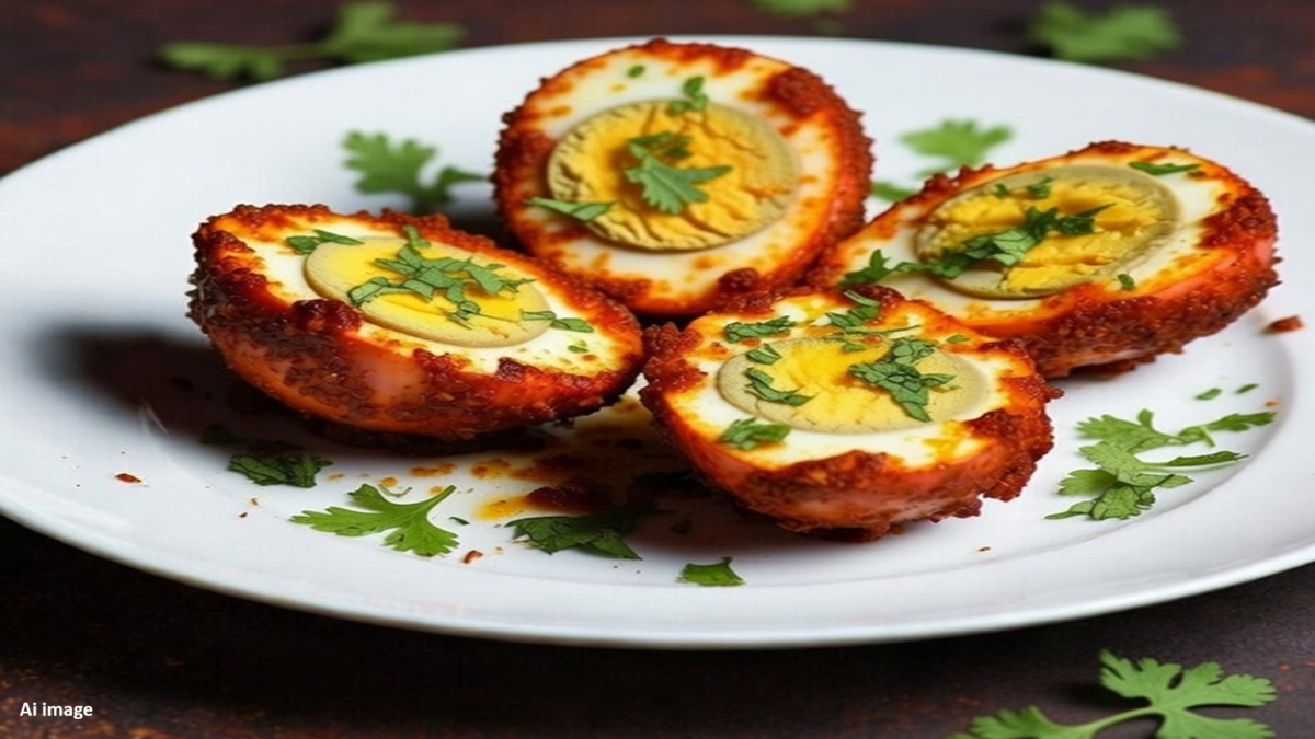 सर्वात आधी अंडी एका पॅनमध्ये उकळवा. शिजल्यानंतर, अंडी काढा, सोलून घ्या आणि चाकूने किंवा कटिंग मशीनने चिरून घ्या. आता चिरलेली अंडी बाजूला ठेवा आणि ग्रेव्ही तयार करा. ग्रेव्ही बनवण्यासाठी, टोमॅटो, काश्मिरी लाल मिरच्या आणि लसूण बारीक करून पेस्ट बनवा. पेस्ट तयार झाल्यावर, एका भांड्यात ठेवा. आता पॅनमध्ये तेल आणि बटर गरम करा. चिरलेला कांदे घाला आणि सोनेरी तपकिरी होईपर्यंत परतून घ्या. तयार पेस्ट घाला आणि धणे पूड आणि गरम मसाला पावडर मिसळा. २ मिनिटे शिजल्यानंतर, अर्धा कप पाणी घाला. काही सेकंद ढवळल्यानंतर, अंडी घाला आणि मिक्स करा. आता ५ मिनिटे शिजल्यानंतर, गॅस बंद करा आणि कोथिंबीर घाला. तर चला तयार आहे रोस्टेड मसाला अंडी रेसिपी, गरम नक्कीच सर्व्ह करा.