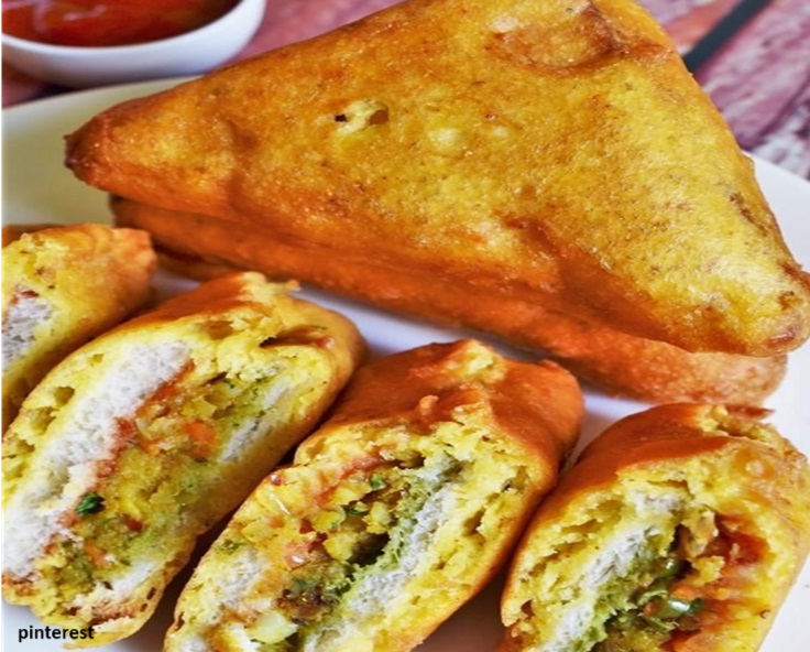 सर्वात आधी उकडलेले बटाटे मॅश करा. आता त्यात हिरवी मिरची, कोथिंबीर, लाल मिरची पावडर, मीठ आणि चाट मसाला घाला. व चांगले मिसळा. आता ब्रेडचा स्लाईस घ्या, त्यावर शेझवान चटणी लावा. नंतर त्यावर बटाट्याचे मिश्रण पसरवा. वर दुसरा ब्रेड स्लाईस ठेवा आणि हलके दाबा. सर्व ब्रेड सँडविच त्याच प्रकारे तयार करा आणि त्यांना त्रिकोणी आकारात कापून घ्या. आता बेसनामध्ये हळद, लाल मिरची, मीठ आणि ओवा मिसळा. पाणी घाला आणि खूप पातळ किंवा जास्त जाड नसलेले बॅटर तयार करा.