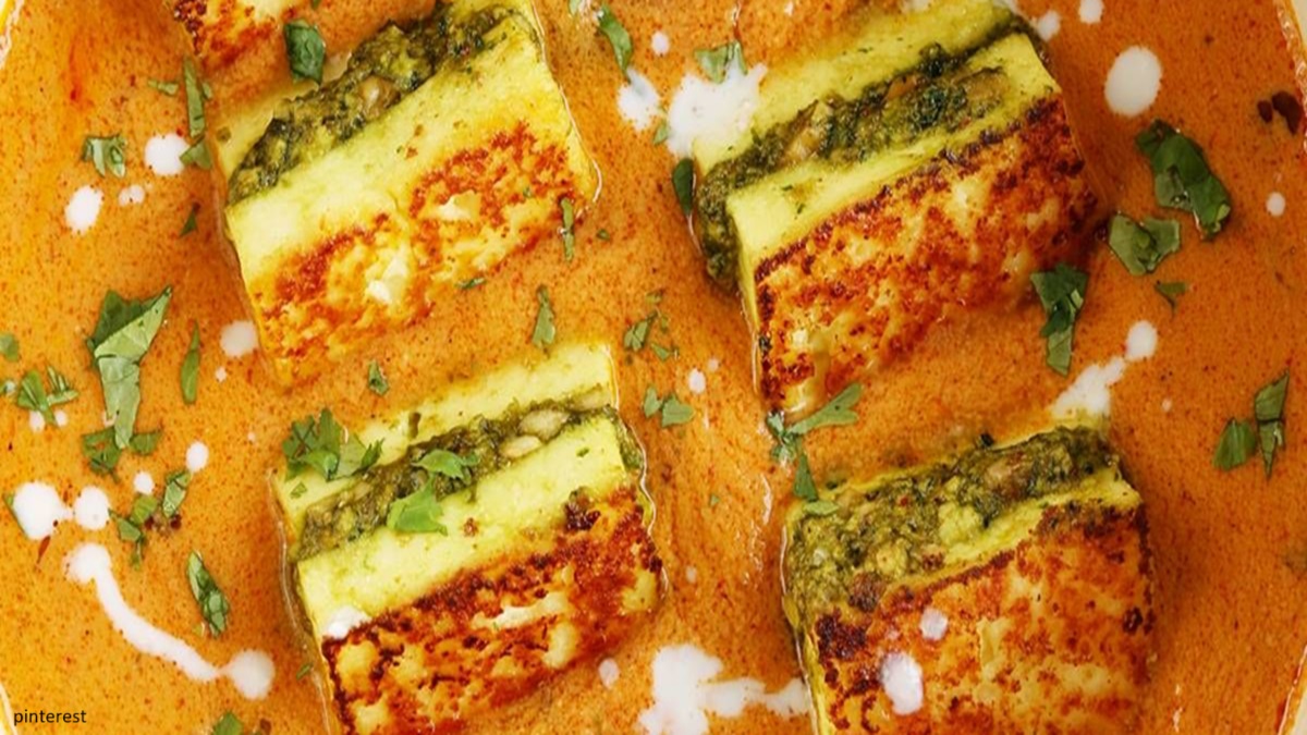सर्वात आधी एका भांड्यात चिरलेला कांदा, लसूण पाने, तमालपत्र, वेलची, हिरवी मिरची, दालचिनी, लवंगा, थोडे मीठ आणि एक कप पाणी घाला आणि ते उकळण्यासाठी ठेवा. आता, पनीर घ्या आणि त्यांचे त्रिकोणी तुकडे करा. यानंतर, पनीरचे उरलेले तुकडे चुरा, त्यात कोथिंबीर पेस्ट आणि काजूचे तुकडे घाला आणि मिक्स करा आणि त्यांचे स्टफिंग तयार करा. आता पनीरचे त्रिकोणी तुकडे घ्या आणि एका पनीरच्या तुकड्यात तयार केलेले स्टफिंग त्यात भरा आणि वर दुसरा त्रिकोणी तुकडा ठेवा आणि तो दाबा. त्याचप्रमाणे सर्व तुकडे स्टफिंगने भरा आणि एका प्लेटमध्ये बाजूला ठेवा. यानंतर, एका भांड्यात कॉर्न फ्लोअर घालून द्रावण तयार करा आणि एका पॅनमध्ये तेल टाका आणि ते गरम करण्यासाठी ठेवा. तेल गरम झाल्यावर, भरलेले पनीरचे तुकडे घ्या आणि ते कॉर्न फ्लोअरच्या द्रावणात बुडवा आणि ते लेप करा आणि ते पॅनमध्ये ठेवा. त्याचप्रमाणे, सर्व पनीरचे तुकडे एक एक करून लेप करा आणि ते पॅनमध्ये ठेवा आणि हलके तळा. आता कांदा मिसळलेले मसाले घ्या आणि ते पाण्यातून काढून टाका आणि त्यांची पेस्ट तयार करा. आता पुन्हा एक पॅन घ्या आणि त्यात १ टेबलस्पून तेल गरम करा. तेल गरम झाल्यानंतर, त्यात तमालपत्र आणि वेलची घाला. तमालपत्रांचा रंग बदलला की, कांद्याची पेस्ट घाला आणि मध्यम आचेवर शिजवा. काही सेकंदांनी, पेस्टचा रंग सोनेरी झाल्यावर, टोमॅटो प्युरी घाला आणि शिजवा.