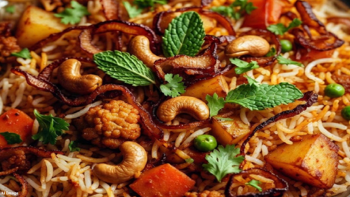 बिर्याणी: ताजे खडे मसाले, भाज्या आणि केशरयुक्त लांब दाण्याचा बासमती तांदूळ वापरून बनवलेली 'दम' बिर्याणी.